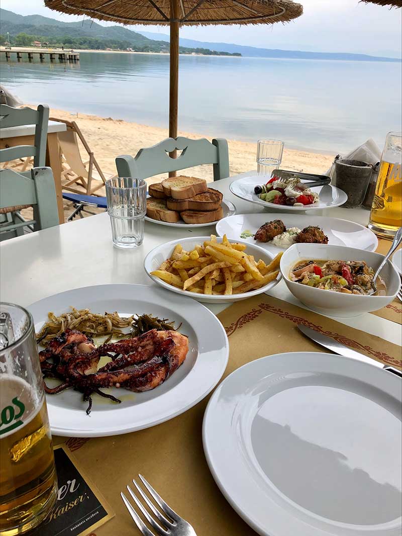 Πέρα από το Μπαλκονάκι που ανέφερα παραπάνω, δεν μπορώ να ξεχωρίσω κάποιο συγκεκριμένο ταβερνάκι — η Χαλκιδική είναι γεμάτη με ωραίες επιλογές! Υπάρχουν ταβερνάκια πάνω στην άμμο, όπου τα παιδιά κάθονται και παίζουν με τα κουβαδάκια τους όσο περιμένουμε το φαγητό, αλλά και άλλες πιο μέσα στο πράσινο, μέσα στη φύση, με δροσιά και χαλαρή ατμόσφαιρα. Σε κάθε γωνιά της Χαλκιδικής θα βρεις κι από ένα μέρος να φας καλά και οικογενειακά.